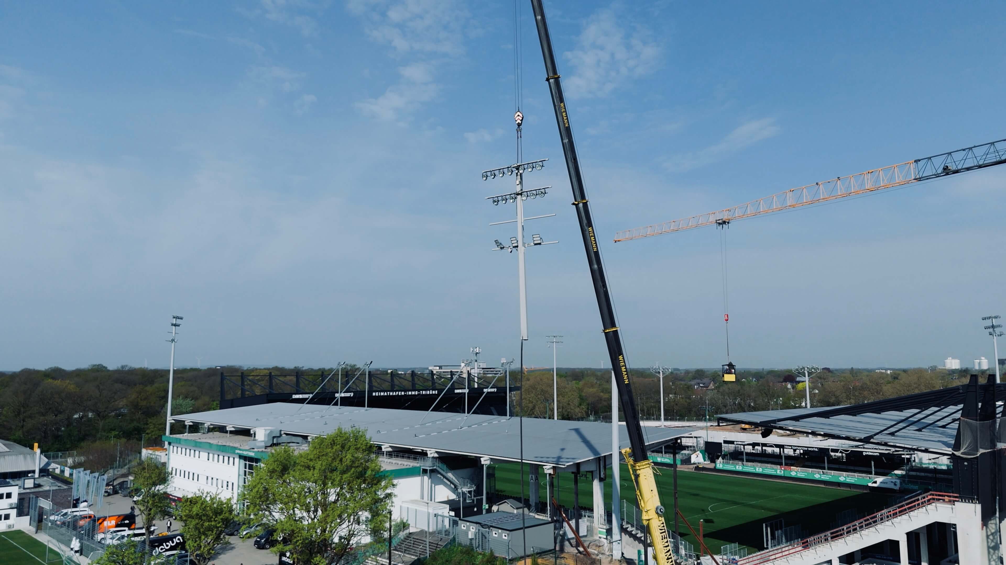 Zukünftig wird das LVM-Preußenstadion durch moderne LED-Strahler, die direkt unter den Tribünendächern montiert sind, ausgeleuchtet. Noch bleiben aber vor allem die Flutlichtmasten auf der Nordseite, die ab dem Sommer umgebaut wird, erhalten. Der am Freitag zurückgebaute Flutlichtmast stammt in seiner heutigen Form aus dem Jahr 1990 und ersetzte einen Vorgänger aus den 1950er-Jahren. Mit einer Höhe von rund 32 Metern prägte er gemeinsam mit den drei übrigen alten Masten seit Jahrzehnten das Stadionbild.