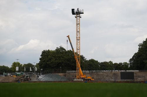 Ein Blick in den Osten genügt, um dort schnell die größte Veränderung zu erkennen: Am Montag wurde ein Kran aufgebaut und prägt das Bild der eindrucksvollen Baustelle. Darüber hinaus laufen dort weiter die Vorarbeiten für den Bau der neuen Tribüne, für die der Kran dann zukünftig benötigt wird.