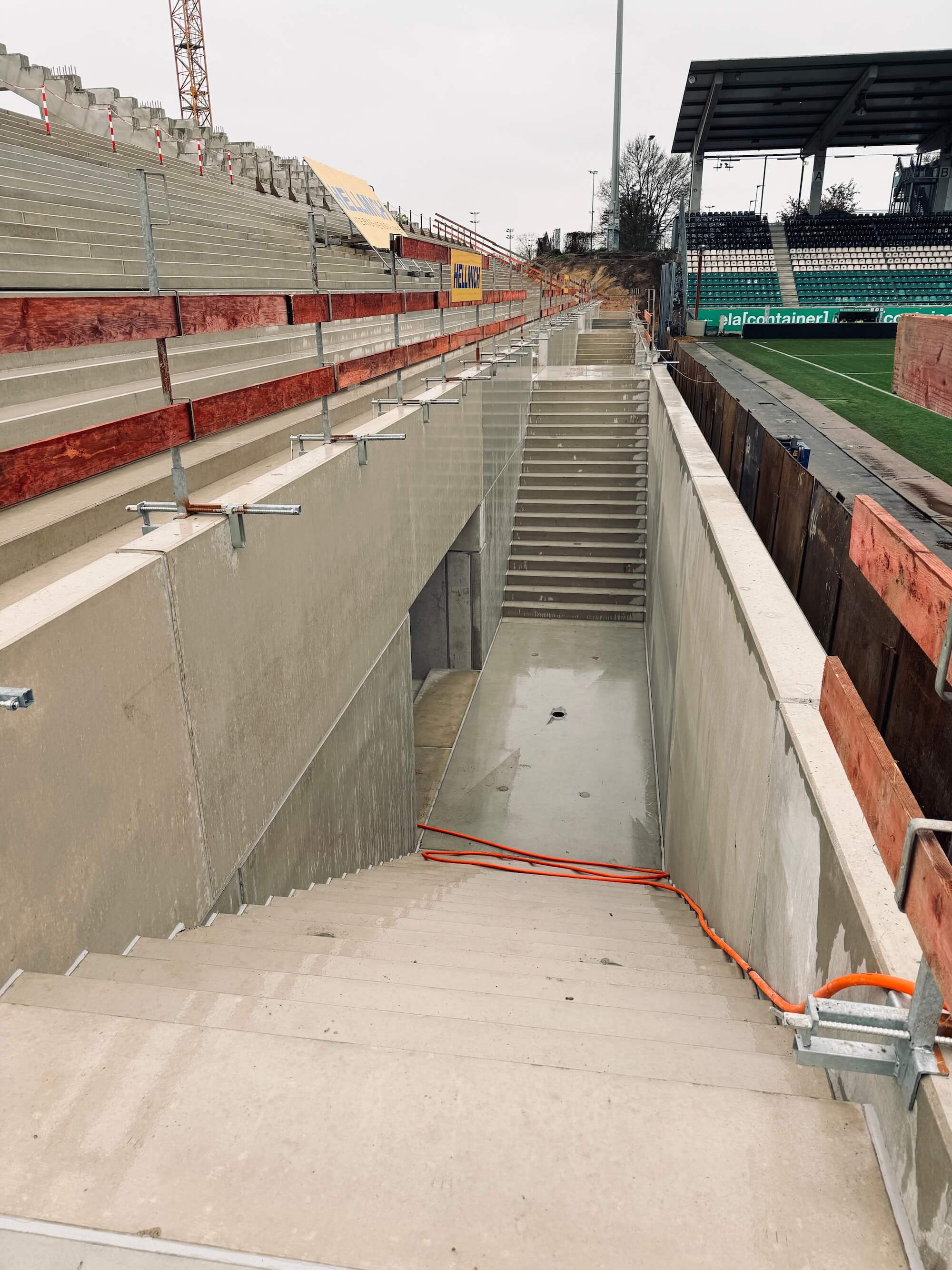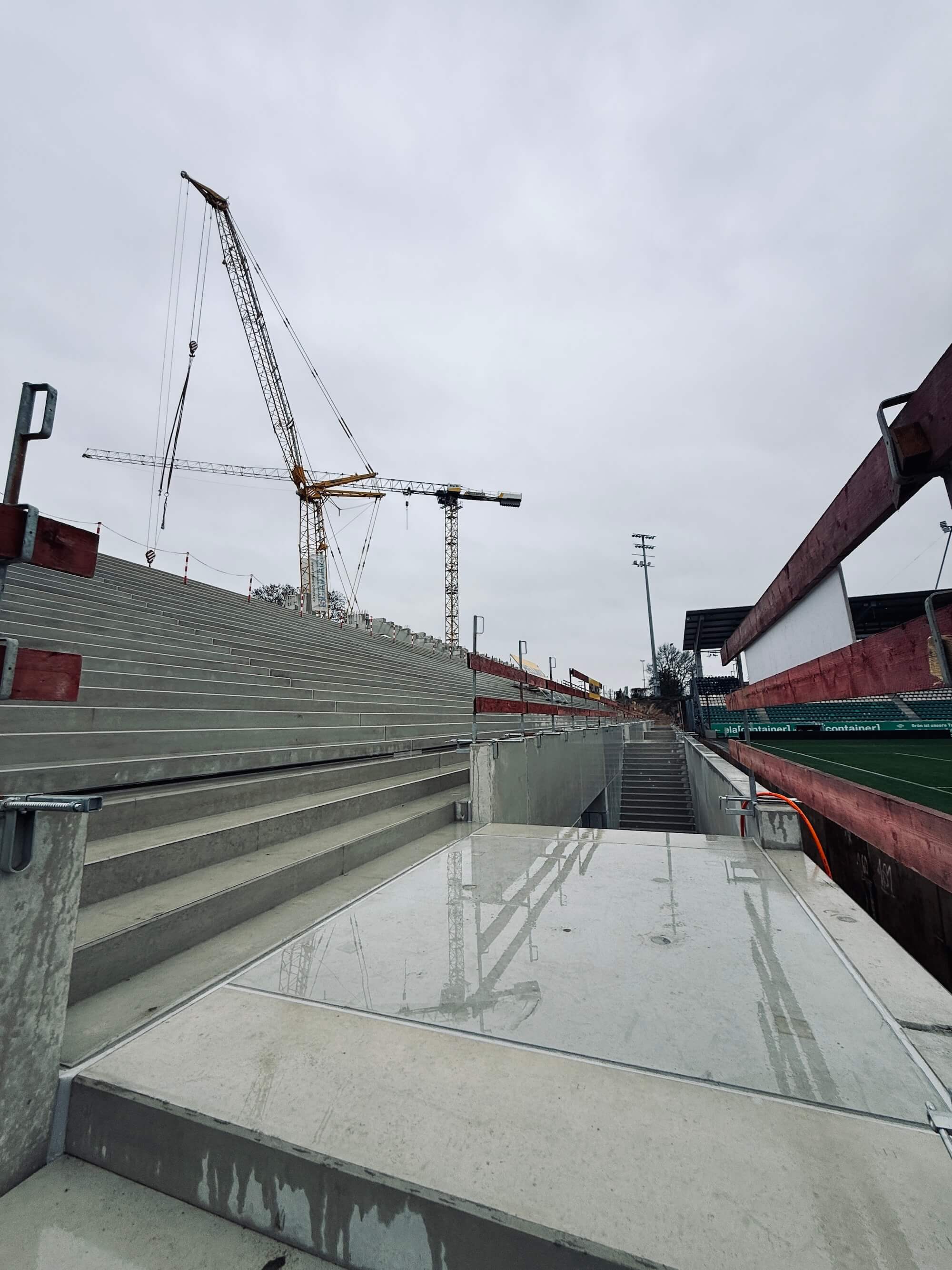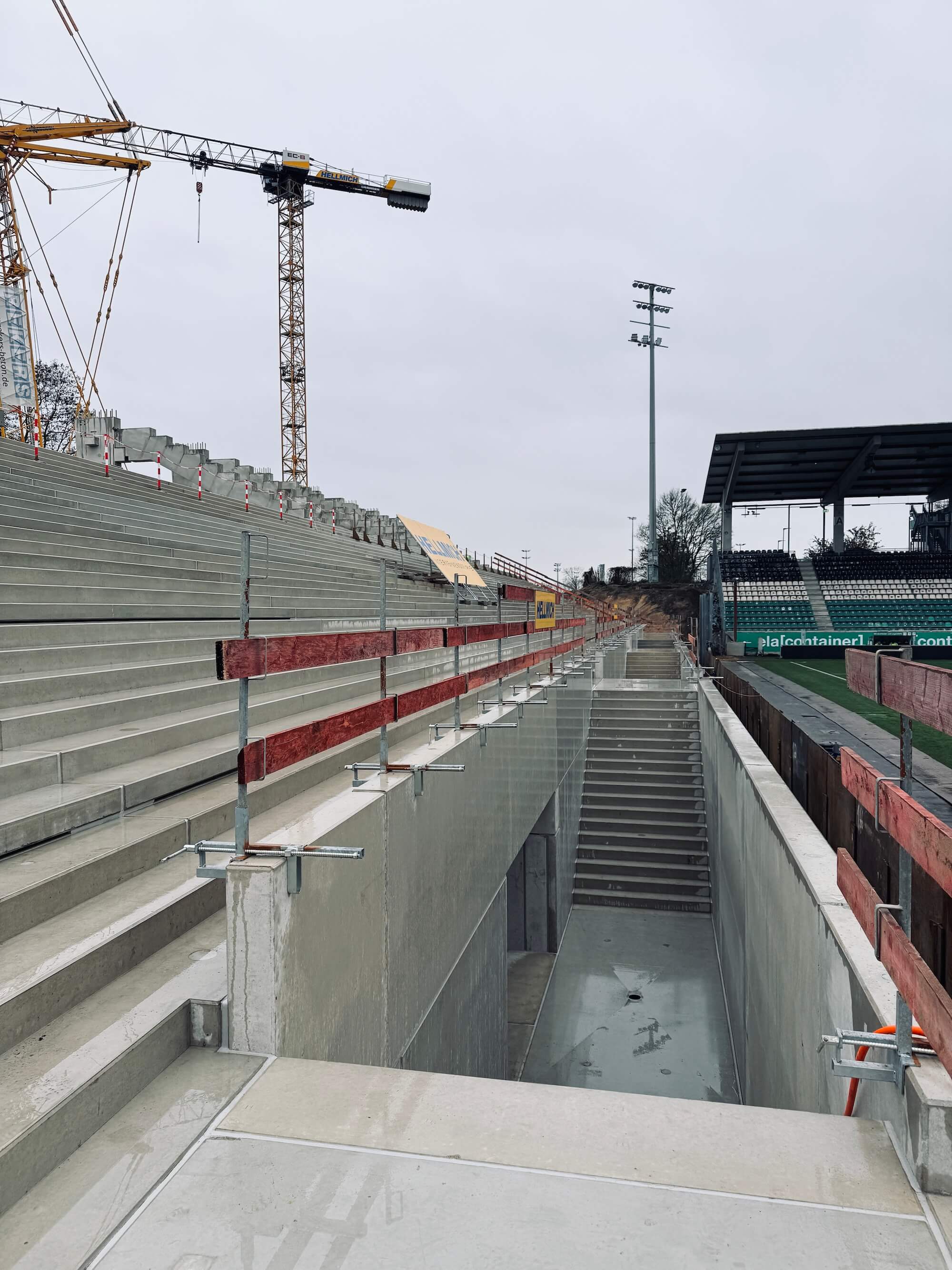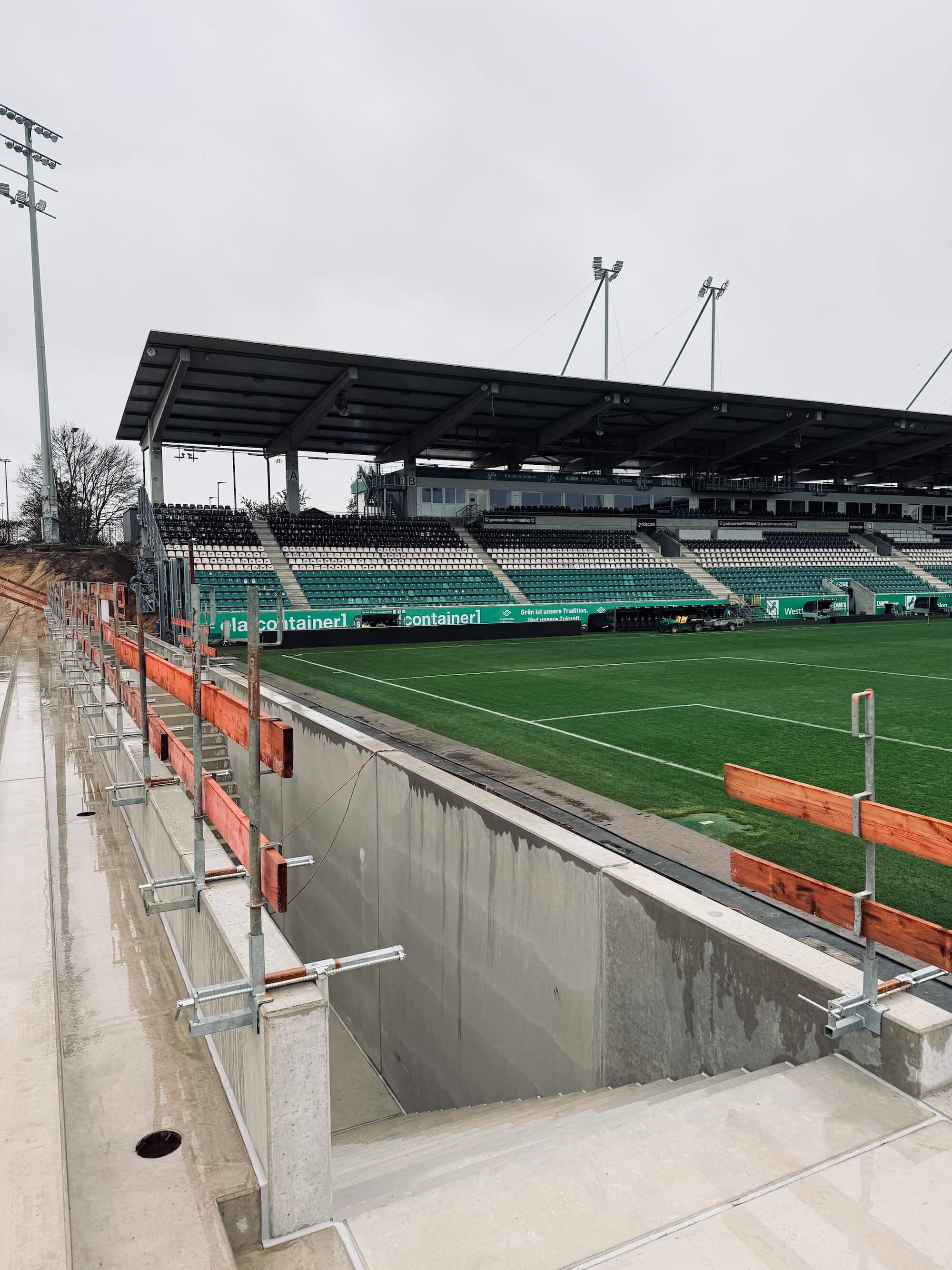 Das schmuddelige Herbstwetter hat Münster fest im Griff. Doch auch 5°C und Dauerregen halten die Männer vom Bau nicht von der Arbeit ab. Es wird weiter ordentlich Gas gegeben, um die Osttribüne wachsen zu lassen. Vor allem hinter bzw. unterhalb der ersten Stufenreihen hat sich in den vergangenen Tagen einiges getan. Die Wegeführungen und Gebäudeteile unterhalb der eigentlichen Stehränge zeugen mehr und mehr von der komplexen Gebäudestruktur, die später für ein ganz besonderes Stadionerlebnis sorgen soll. Auch der „Graben“, von dem aus die Stehränge über eine großzügige Treppengestaltung mundlochfrei erschlossen werden, sind nun deutlich zu erkennen.