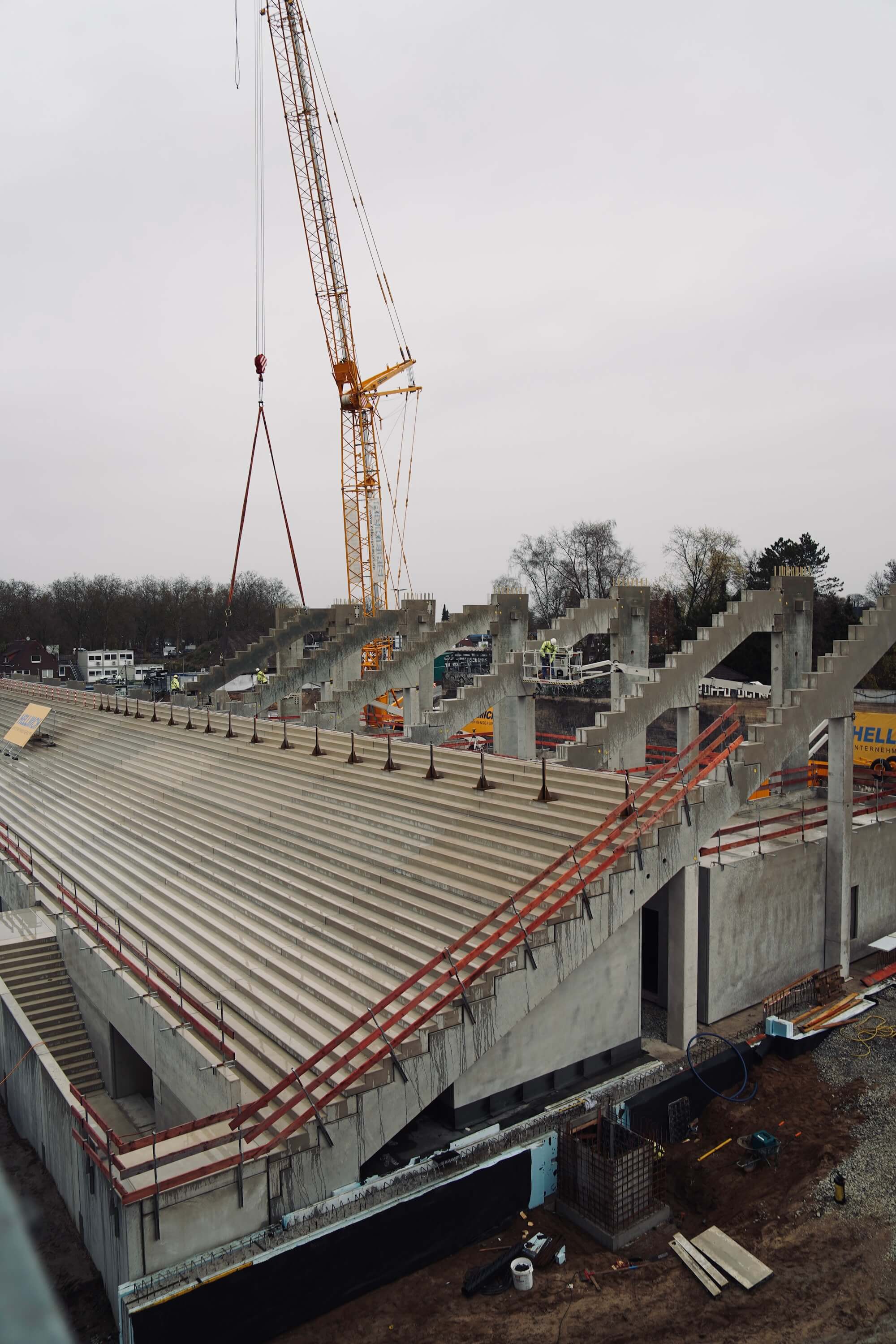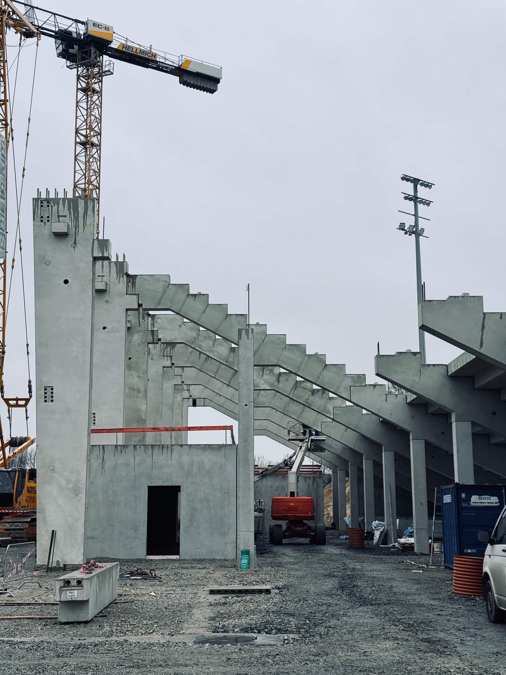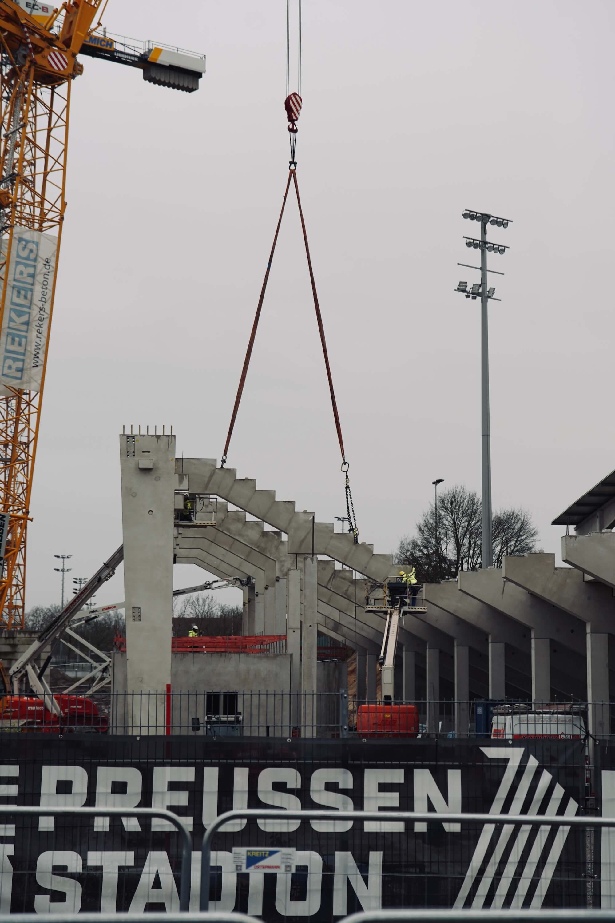 Derzeit spielen sich die meisten Bauarbeiten im Südosten ab, also da, wo sich später die neue Ostkruve an das Funktionsgebäude mit Kindertagesstätte und Geschäftsstelle anschließen wird. Im Minutentakt schweben dort am Donnerstag neue Fertig-Betonteile ein, um die nächsten Zahnbalken aufzulegen, auf deren Bodenplatten zukünftig fast 9.000 Stehplatzbesucher eine neue und stimmungsvolle Heimat finden werden.