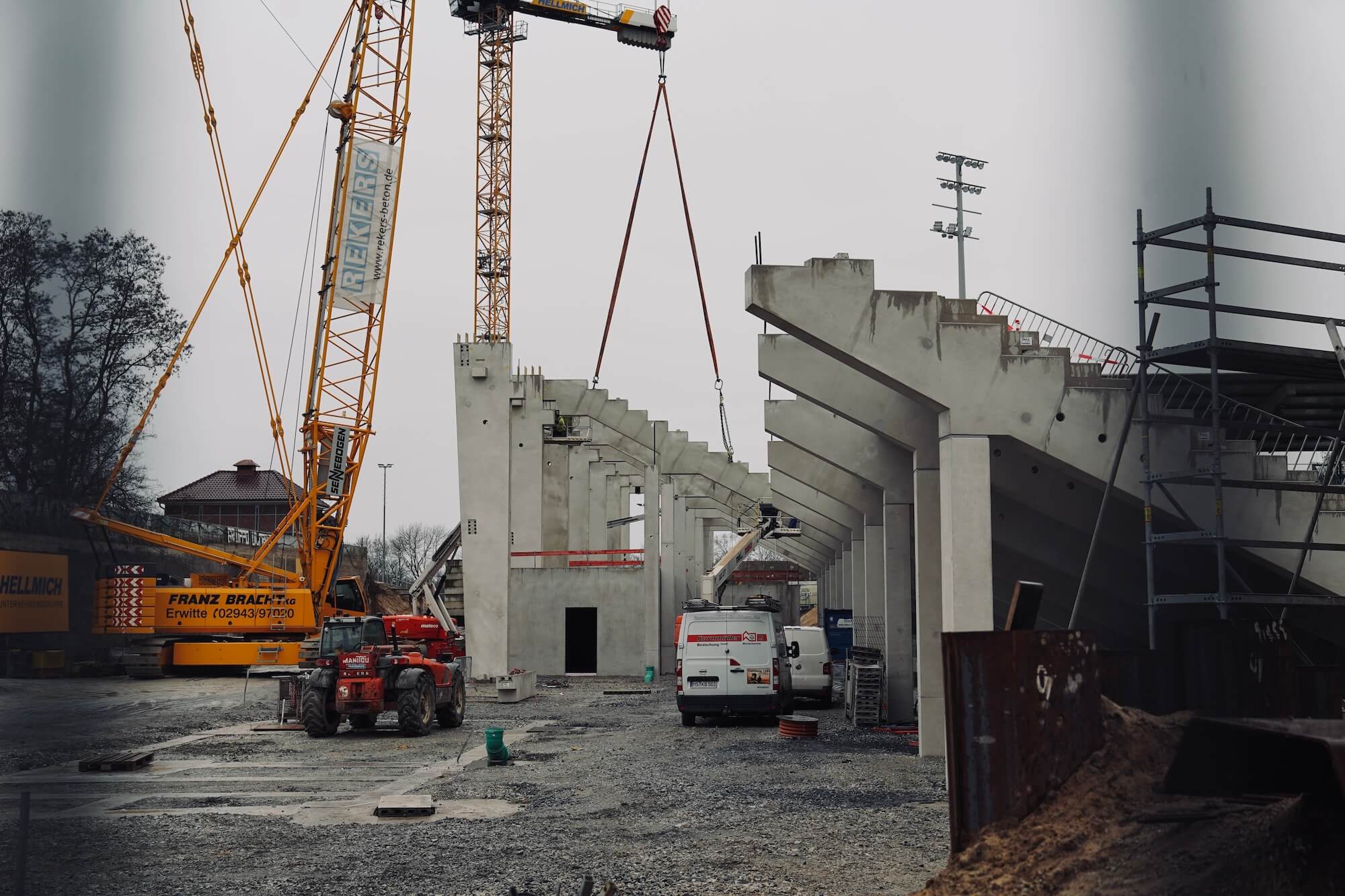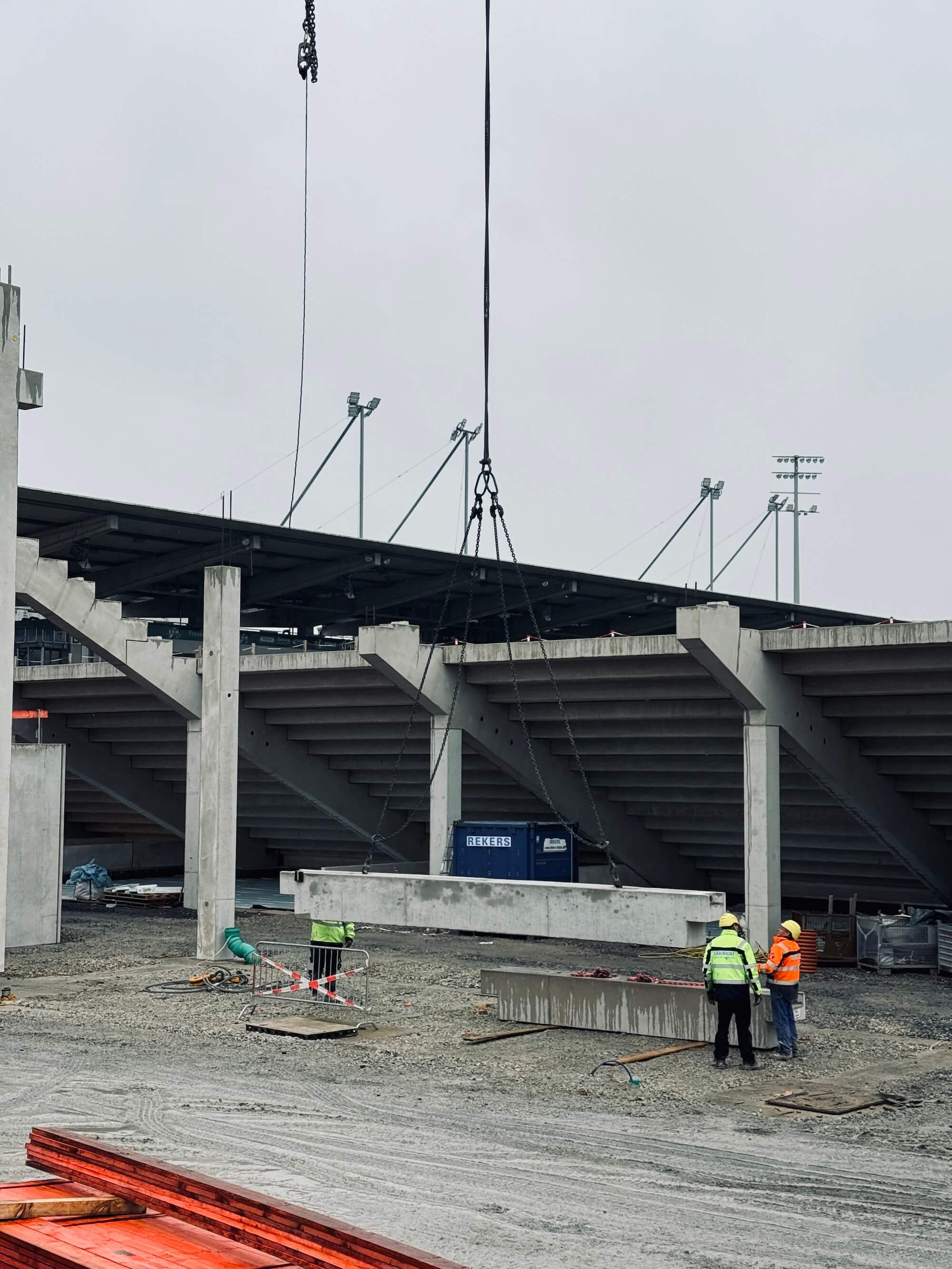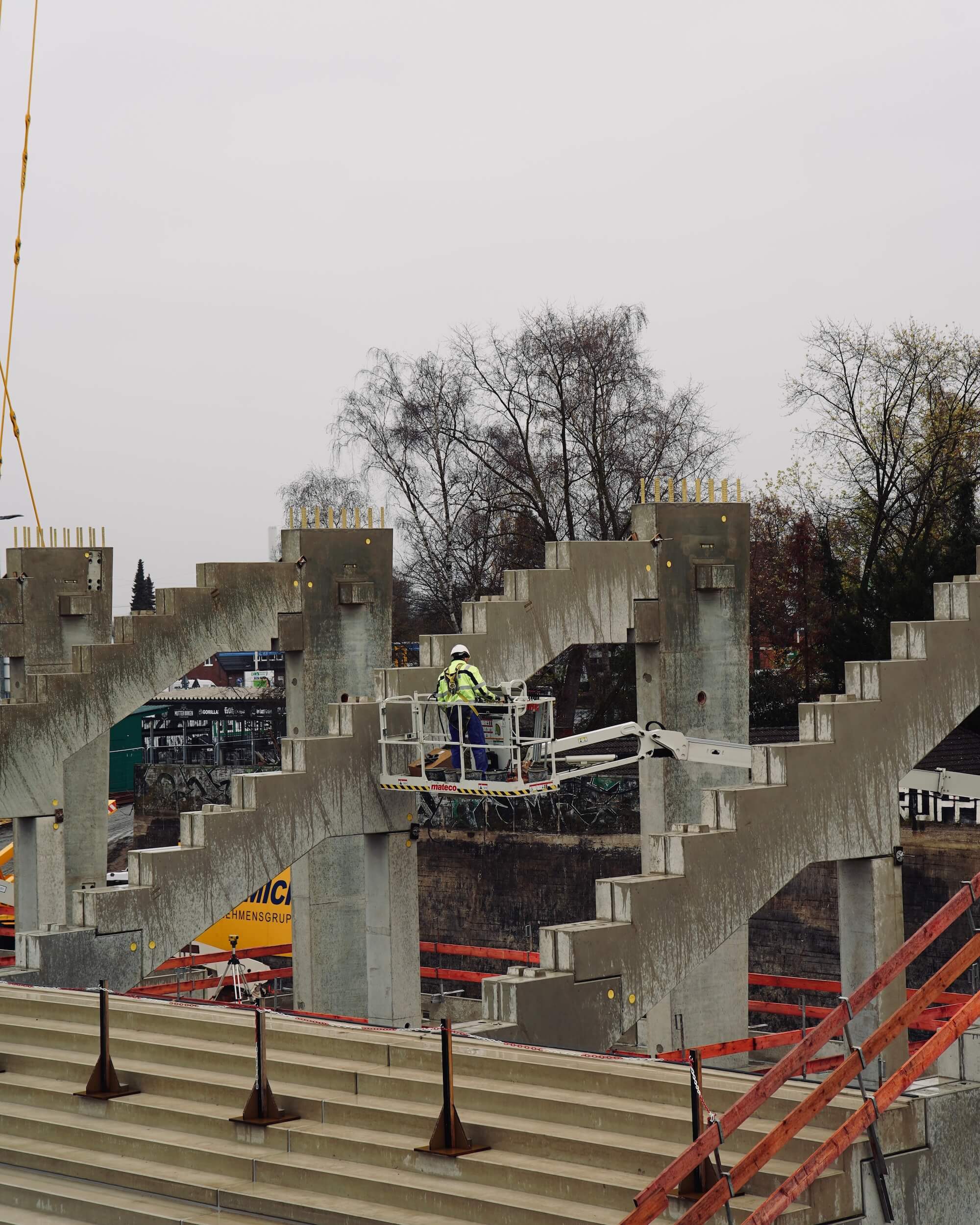 Derzeit spielen sich die meisten Bauarbeiten im Südosten ab, also da, wo sich später die neue Ostkruve an das Funktionsgebäude mit Kindertagesstätte und Geschäftsstelle anschließen wird. Im Minutentakt schweben dort am Donnerstag neue Fertig-Betonteile ein, um die nächsten Zahnbalken aufzulegen, auf deren Bodenplatten zukünftig fast 9.000 Stehplatzbesucher eine neue und stimmungsvolle Heimat finden werden.